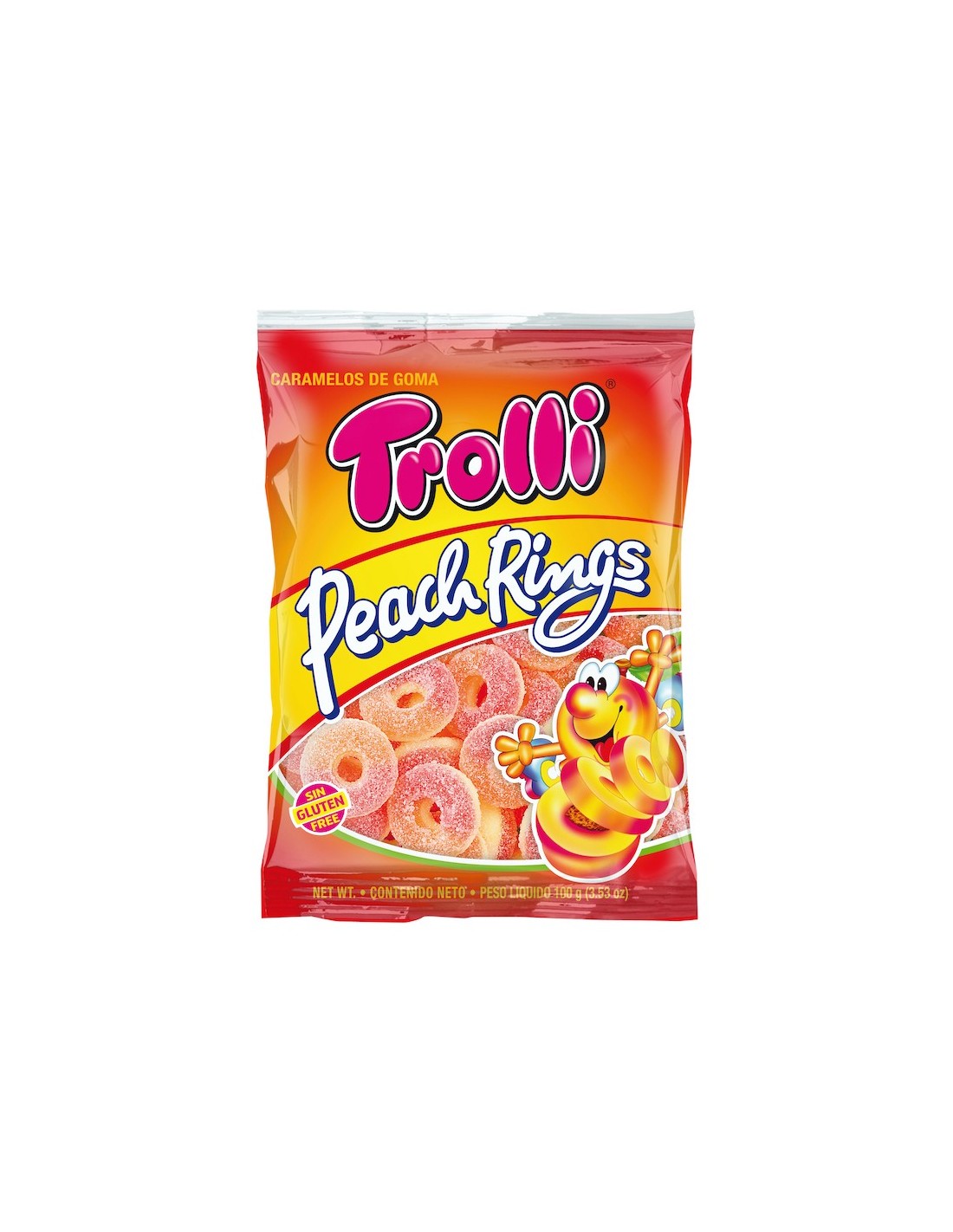 ¿Estás aburrido? ¡Ponte un Peach Ring entre los dientes y tira de él todo lo que puedas! O prueba a ponerte uno en cada dedo y cómetelos! ¡Notarás el sabor ácido al principio y después un delicioso sabor a melocotón! Peach Rings de Trolli, ¡un clásico!